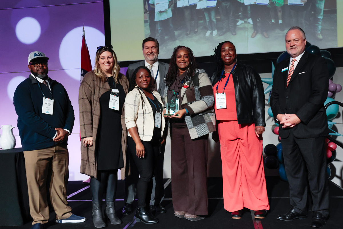 ABPG presented Blytheville with the 2025 Don A. Zimmerman Pinnacle Award for the city’s outstanding efforts in the category of education and workforce development. Above from left, Blytheville Council Member Jacquin Benson, Jr., Stacey Walker and Jernal Woods with Arkansas Northeastern College, League Executive Director Mark Hayes, Blytheville Mayor Melisa Logan, Blytheville HR Director Dr. Alisha Williams and Crews & Associates Senior Managing Director Paul Phillips.